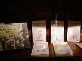 れんが造りの門をくぐって階段を下りていくと、ガラス越しに見える店内は照明を落として壁際にスポットライトをあてた、あたたかでクワイエットな空間。回廊風にブックシェルフが配置され、ゆるやかなカテゴリーで選ばれた本が1冊1冊丁寧に置かれています。店名の雨にちなんだ本、旅を題材にした本やビートニクの詩集、新旧の絵本(洋書も和書も)、写真集、ごく初期のものと思われるチャリー・ブラウンシリーズのコミックブック、そしてSwitchと関係の深い作家片岡義男さんセレクトによる絵本も並んでいました。雑誌SwitchやCoyoteもバックナンバーをふくめて書棚にそろっています。