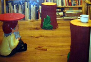 メルヘンなスツールに腰かけて、あれこれ本の探索。