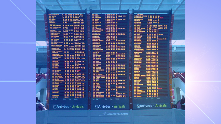 A flight departure screen at Charles de Gaulle Airport, 05:21, 29