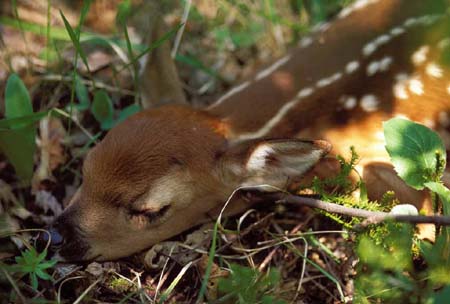 森を歩いていた大竹さんの足元に、生まれて間もないシカの子が眠っていた。これは安全のポーズとか。