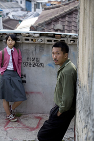 こう書いてくると、汚い言葉と暴力で埋めつくされた悲惨で不幸な映画に聞こえるかもしれない。たしかに悲惨ではある。ただ全体の印象は違ったものだ。そこが映像作品の不思議さで、表面は醜いものでおおわれていても、その底に流れているものは絶望感やあきらめではない。それが何かと言うのは難しいが、たとえば、真剣さとか率直さとか幼さとか、人間誰もがもつ、少なくとも幼年時代には持っていた柔らかくて壊れやすいもの、そういったものだろうか。サンフン(チンピラの名前。ヨニから赤ちゃんの名前みたい、とからかわれる)は、幼い。30歳前後と思われるが、その表情はときに小さな子どものように頼りなく不安げだ。ヤクザっぽい短髪にダサイ服、靴はそこらへんのスニーカー。いまだにポケベルをもちヨニから「Stone Age」とからかわれ、Playstationが何かも知らない。