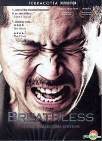 ちなみに日本語タイトルは英語版からの翻訳のようだ。韓国語の原題は「똥파리(トンパリ)」。トンは糞、パリはハエ。糞に群がるハエのことだそう。広告用(あるいはDVD用)のスチール写真もそれぞれで、日本版はサンフンとヨニの出会いのシーンのカット、英語版DVDではサンフンの叫んでいるところ(泣いている?)の顔のどアップ、韓国版ではサンフンが道に座りこんでタバコを吸っているもの。英語版のものは英語圏の人にはやはり、こういうはっきりした意図の写真がいいのだろうと納得。Breathlessというタイトルから考えても。日本版の写真にBreathlessのタイトルでは多分伝わらないのだろう。日本版の写真に「息もできない」は何の違和感もない。わたしはこの写真がいちばんピンとくるが(二人の表情もこれで充分伝わる)、英語圏の人には顔の表情も空気感も伝わらず、何を意味しているのかのポイントがわからないかもしれない。韓国版の写真は「糞バエ」というタイトルには(韓国の人にとって)ぴったりなのかもしれない。あまりに絵とタイトルが近すぎる感じはするが。ここら辺の微妙な差は、それぞれの文化的背景による感性の表われだろう。もし最初に見た写真が英語版や韓国版のものだったら、ひょっとしてこの映画を見ることにならなかったかもしれない、と思うと、PRというものの意味を改めて考えさせられる。